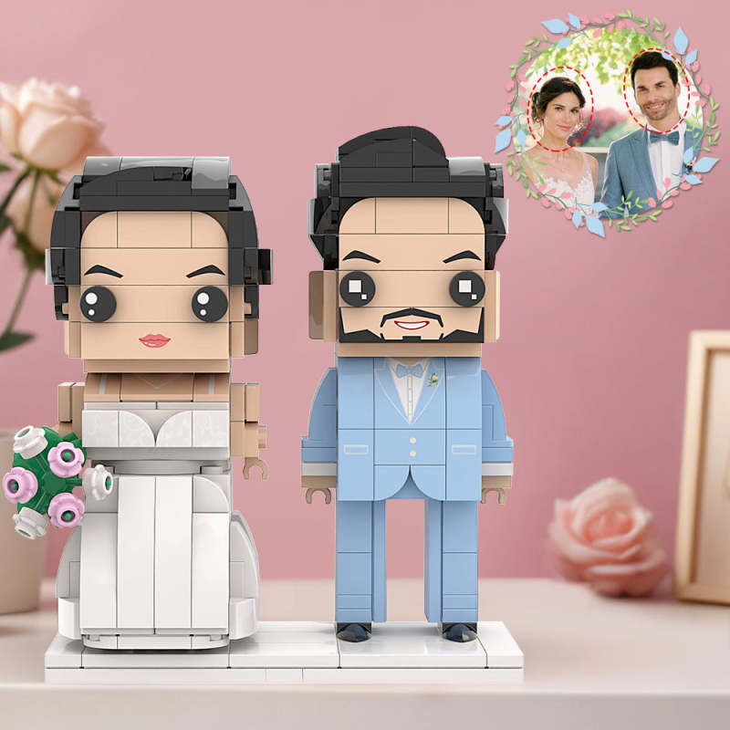 Jasnoniebieski Garnitur Ze Stanikiem I Śnieżnobiałą Suknią Ślubną Para Ceglane Figurki Spersonalizowane Głowy Ceglane Figurki Mały Blok Cząstek Na Pamiątkę Z Okazji Rocznicy Ślubu